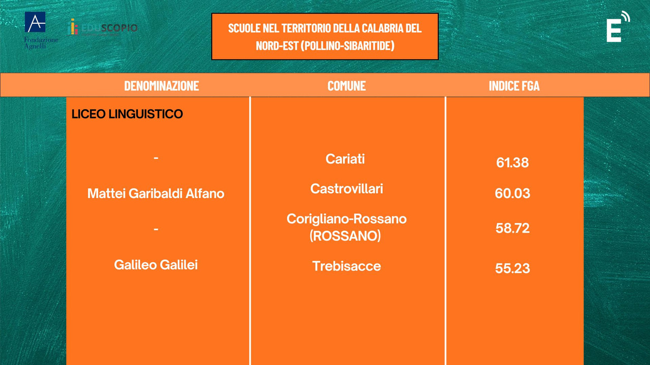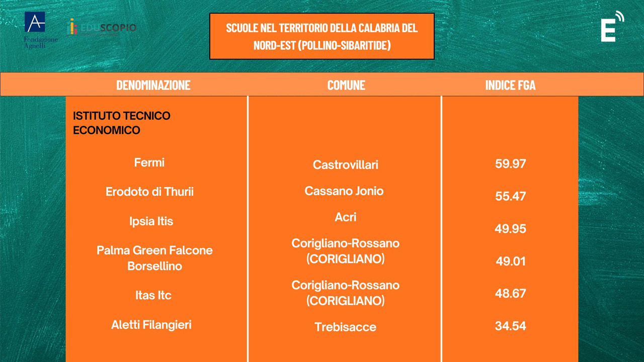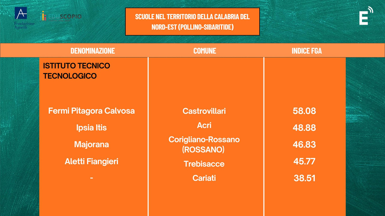 Il Fermi–Pitagora di Castrovillari è il riferimento assoluto dell’indirizzo, con un FGA a 59.97 tra i più alti della Calabria. Subito dietro, e con risultati più che dignitosi, si muovono gli istituti di Acri e Corigliano–Rossano.