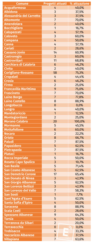 Ci sono poi realtà in cui la situazione appare ancora più rallentata. In alcuni piccoli comuni del territorio tutti i progetti risultano ancora senza pagamenti registrati. È il caso, ad esempio, di Longobucco e Terravecchia, dove la percentuale di progetti a zero trasferimenti arriva al 100%.