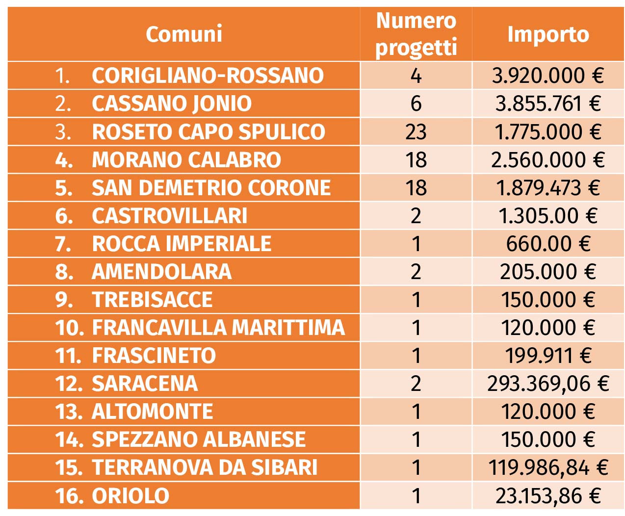 Dal dettaglio illustrato nella tabella che riporta l’elenco dei comuni, dei progetti e degli importi, emergono due elementi significativi: Corigliano-Rossano, insieme a Cassano Jonio, è la città che ha ricevuto il maggiore ammontare di finanziamenti, mentre Roseto Capo Spulico risulta il comune con il più alto numero di progetti approvati (a seguire San Demetrio Corone e Morano Calabro). Una distribuzione che evidenzia, da un lato, la centralità del principale centro urbano dell’area e, dall’altro, una partecipazione abbastanza diffusa dei piccoli comuni alle opportunità offerte dal Piano.