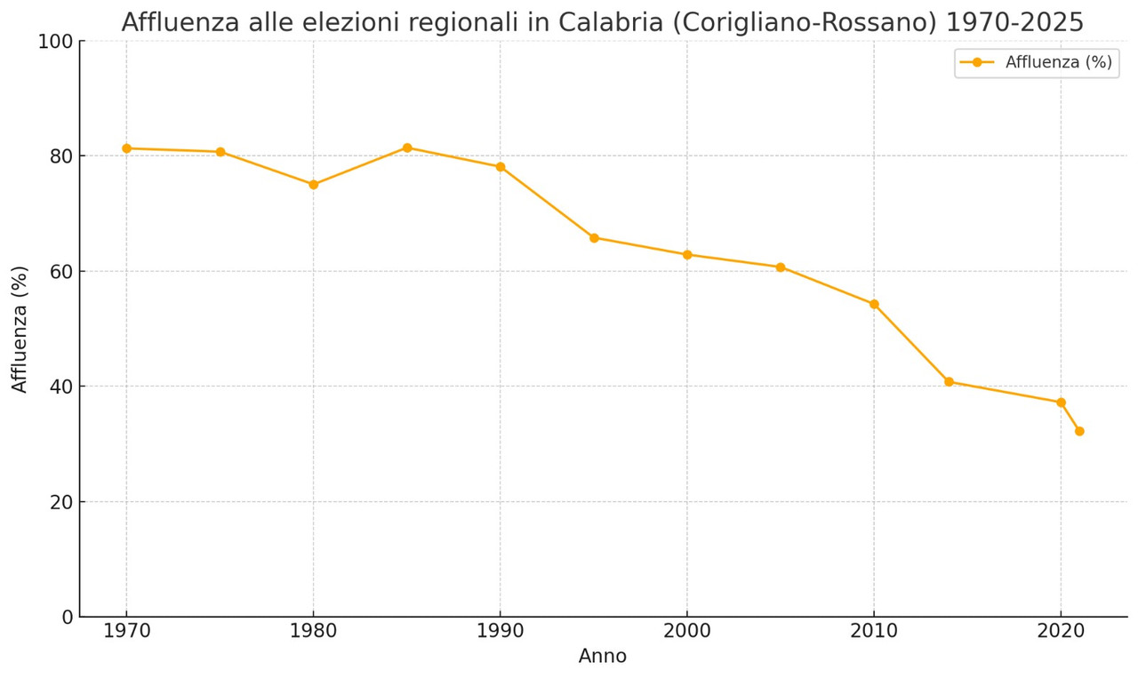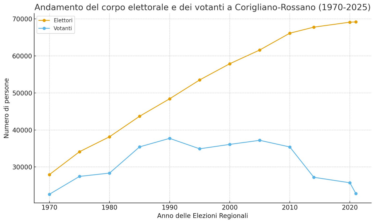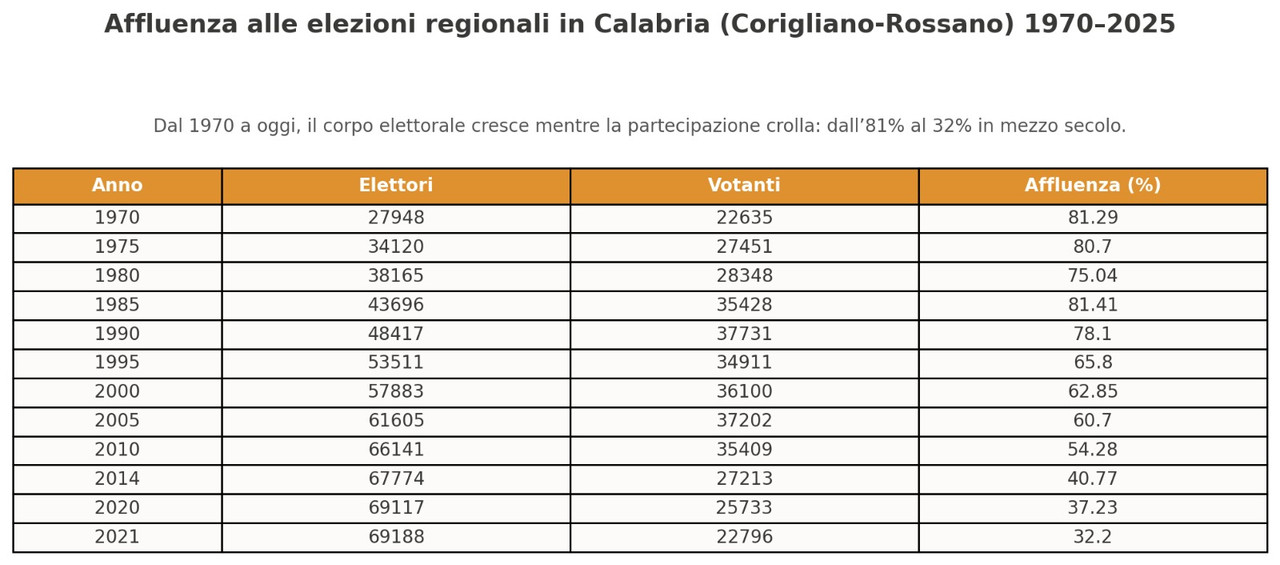 CORIGLIANO-ROSSANO – Un corpo elettorale spento è un corpo elettorale che non ha più aspirazioni, sogni, interessi di futuro. I numeri sull’affluenza di questa tornata elettorale non sembrano restituirci grosse novità in materia di partecipazione. Secondo i dati diffusi da Eligendo, la percentuale di votanti dell’intera regione si attesta, in queste ore, attorno al 30% e non si prevedono sensazionali risalite. Anche un improvviso ed inatteso incremento dei votanti non garantirebbe, comunque, numeri da capogiro che possano anche solo avvicinarsi a quelli dei decenni scorsi.