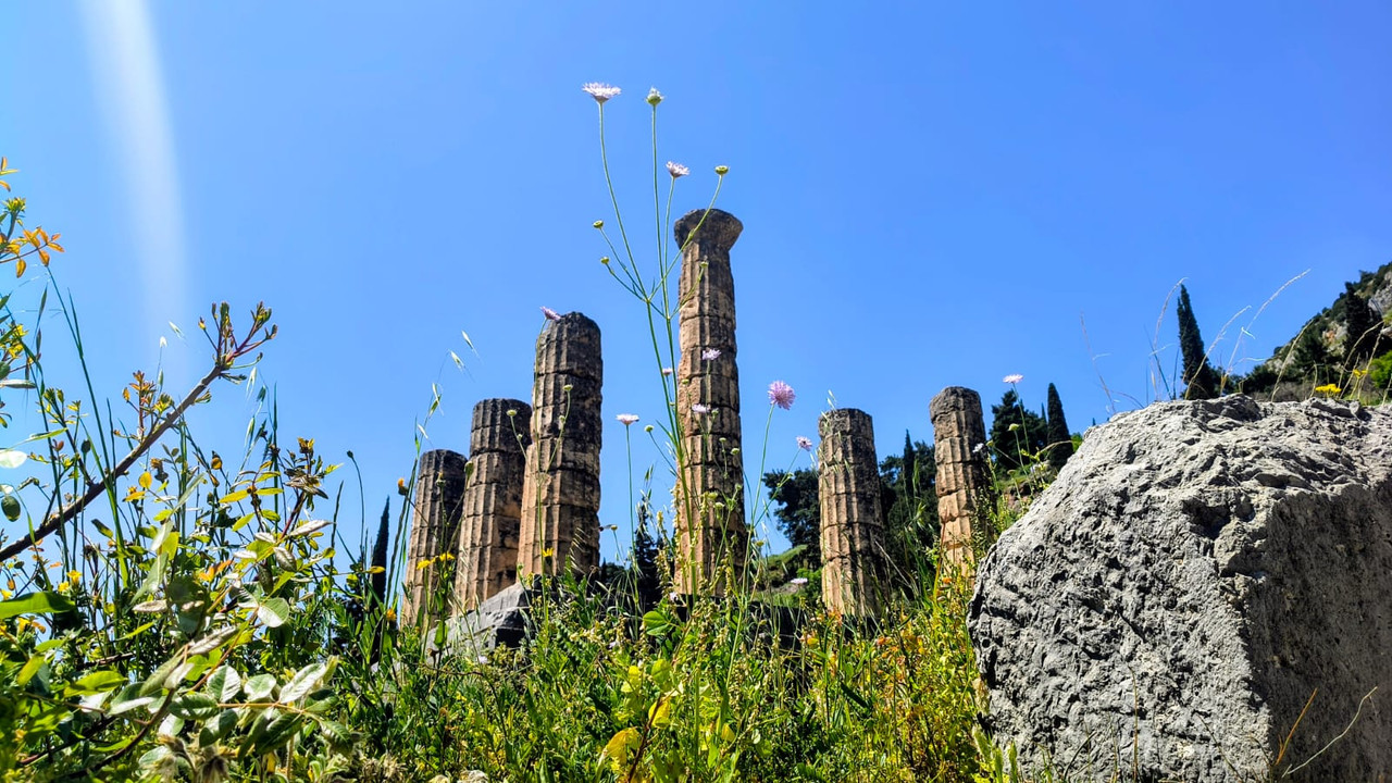 Ci fermiamo davanti allo stilobate. L'architettura qui non è solo costruzione, è musica pietrificata. Le proporzioni doriche sono così perfette che sembrano dettate dal dio stesso per placare il caos del mondo. Non c'è un angolo che non respiri equilibrio: ogni scanalatura delle colonne invita l'occhio a salire verso l'alto, verso l'azzurro assoluto della Focide.