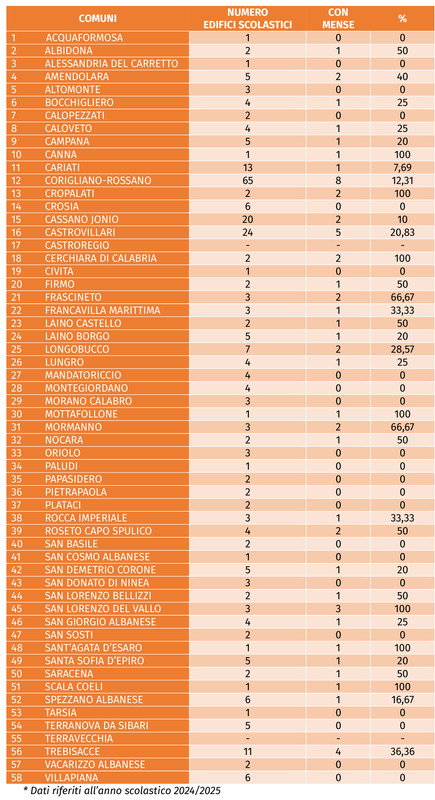 All’interno della Calabria, dove la copertura regionale si ferma al 22,5%, la situazione appare ancora più critica nel quadrante nord-orientale: nei 58 comuni dell’area solo il 20,7% degli edifici scolastici è dotato di mensa (55 su 266 edifici complessivi rilevati). Un dato inferiore sia alla media regionale sia a quella nazionale.